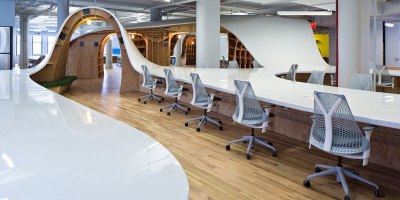 The Barbarian Group Office, New York City Designed by Clive Wilkinson Architects | Photograph by Michael Moran The Barbarian Group is an award-winning advertising agency in New York City. After 8 years at their previous office space, the team grew tired of the countless offices, meeting rooms and ‘scheduled collaborations’. They set their … Continue reading This 1,100 ft long Office Desk Seats All 125 Employees