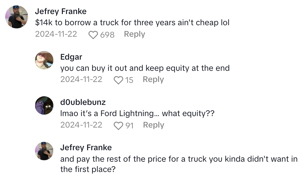The man said that “Ford just can’t move the Lightnings” and said that the company is desperate because it’s offering new F-150 Lightnings for lease for only $202 a month.