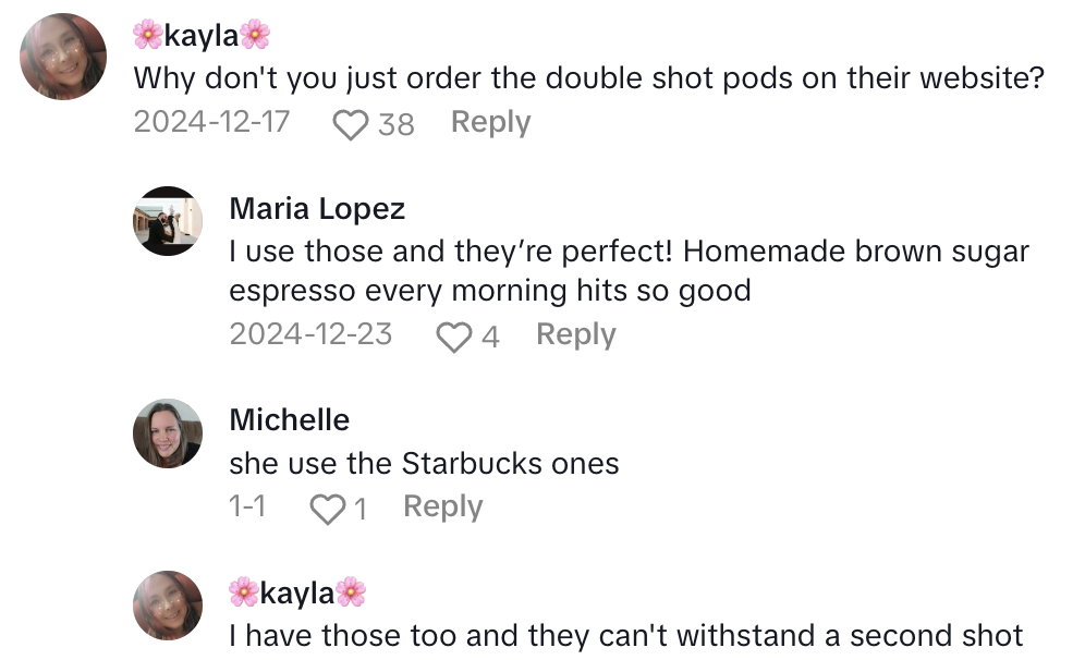 She continued, “I did not realize that people who are wanting more than one shot of espresso in the mornings, like in their coffee, they were using like two or three of these pods every morning. No, you don’t have to do that. Don’t do that. That’s a waste of money.”