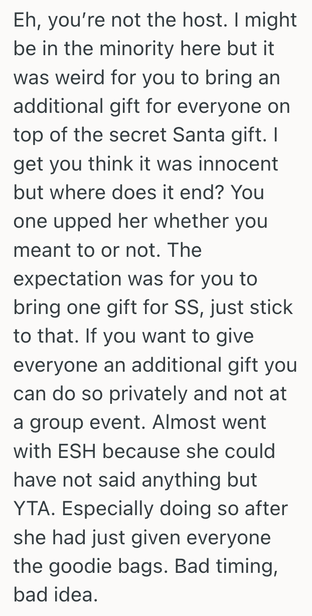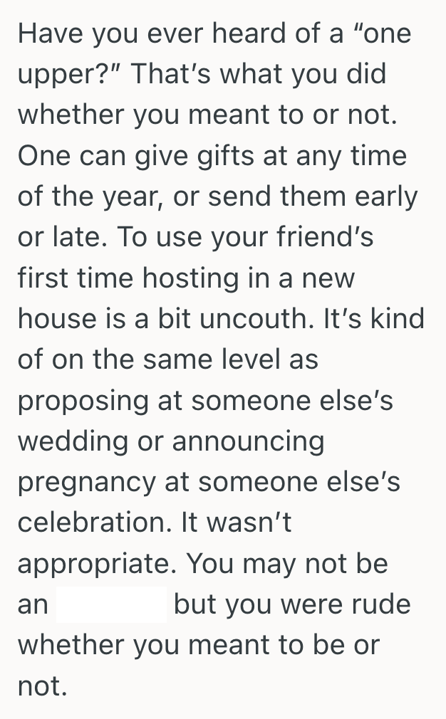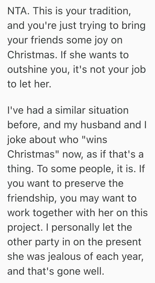 Tags: · aita, christmas, competitive people, Friend Drama, friends, gift giving, gifts, jealousy, new house, one-upper, picture, reddit, secret santa, top