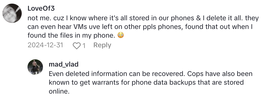 Claire told viewers, “When law enforcement goes through your phone, they typically do what is called a phone dump, which means they are able to plug your phone in, clone it, and they are able to see not only things that are currently in there, but also things that have been deleted, or you thought were deleted.”