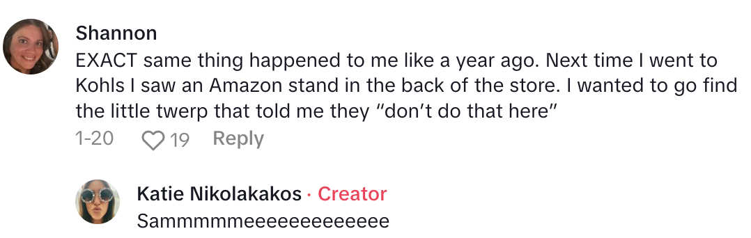 A woman named Katie took to TikTok to tell viewers about how a trip to Kohl’s to drop off a return for Amazon didn’t go as planned.