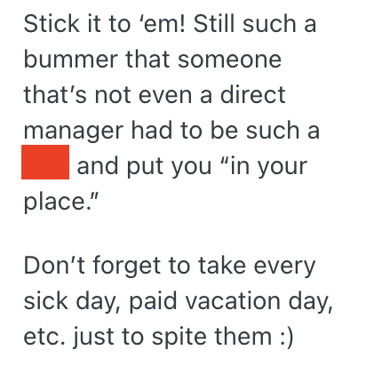 A higher up in a totally different department happened to catch wind that I was leaving early and told my manager to stop letting me leave early because “I’m not special and shouldn’t be able to leave early” to catch a better train for myself.