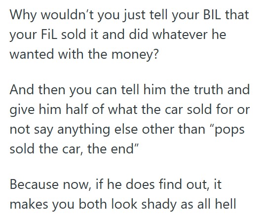 Problem is, a few months before their father passed away, he had secretly sold the car and lent the money to me and John to help us through a tough financial period.