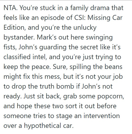 While clearing out the house Mark noticed that the car was missing and accused John of it.