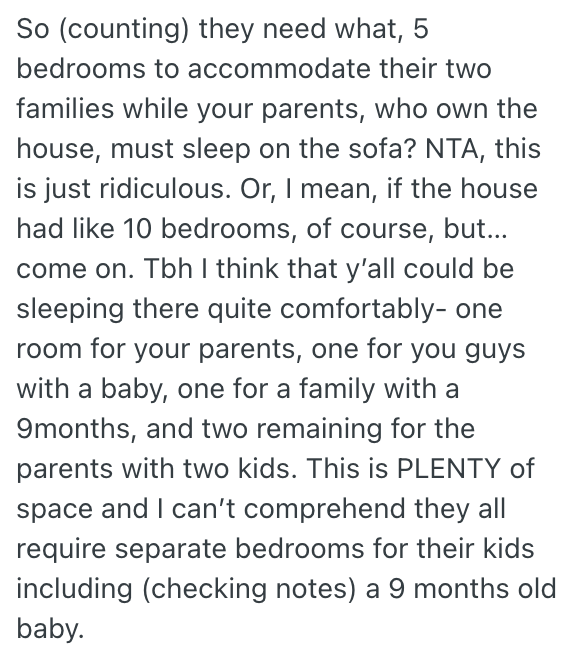 I told them this is ridiculous, and somebody should share a room with their child as my poor parents in their 70s and shouldn’t be sleeping on the sofa.