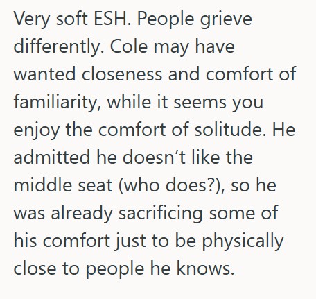 Later in the evening, he texted me that I didn’t appreciate his sacrifice to sit in the middle, and I value my comfort over personal relationships and the needs of other people.
