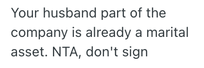 His father is worried that if we ever get divorced, I’ll ask for half of the business’s money, so he wants me to sign a document relinquishing that right.