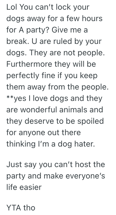 She explains that my dogs can be a bit much, I’m like I don’t know what you are talking about. She says she is fine with them, but doesn’t think in a party setting like this they will be great.