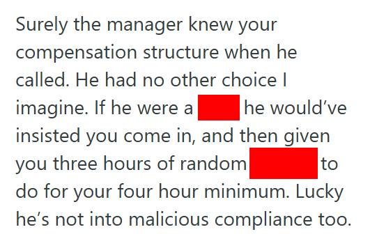 But now for the malicious compliance bit: our contract stipulates a minimum call in of 4 hours, meaning that you cannot pay me less than 4 hours for a day (unless it is by my own choosing). If you call me in for an hour and send me home, I get 4 hours of pay.