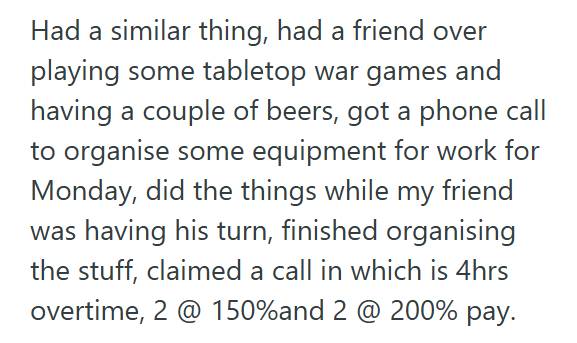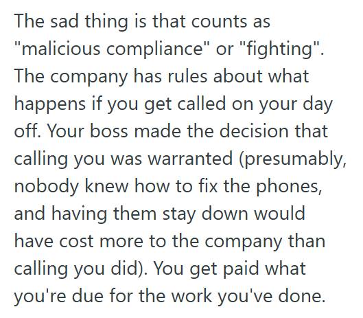 I went right back to my videogames, filled out my time sheet the week after, and said “I know it’s your day off, but” is implied consent for overtime. Minimum callout of 4 hours at 150% is 6 hours. Almost an entire day off with pay in exchange for a 10 minute call? Thank You Very Much!
