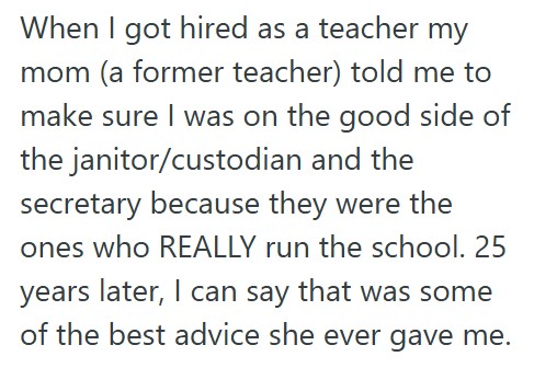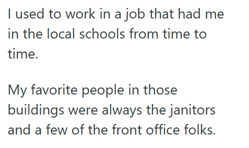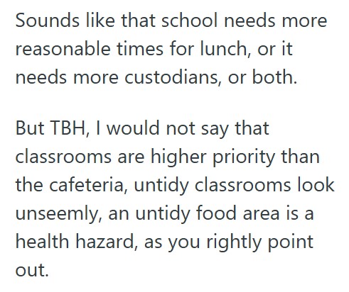 But I explained “I was told by my boss that you guys didn’t like me sweeping or emptying trash around the kids, so now I’m only allowed to do that when the cafeteria is empty. Id love to go get that trash can, but there’s kids eating lunch right now so I’m not allowed.”
