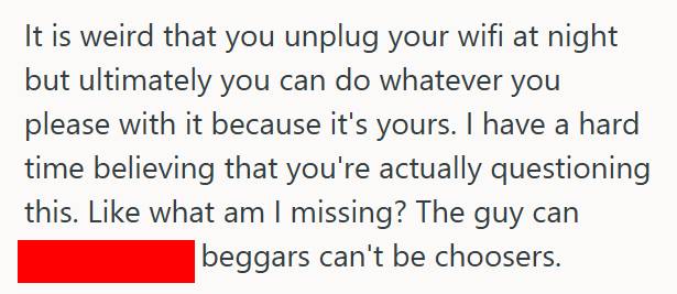 So, what would you do if your neighbor asked for your WiFi password but then got upset when you turned it off at night? Would you let them dictate how you use your own things? Or would you remind them that generosity doesn’t mean unlimited access?