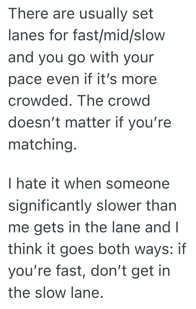 This person was not okay with me swimming quickly, was very rude in telling me to move to a more crowded lane, and was, in fact, a very slow swimmer.