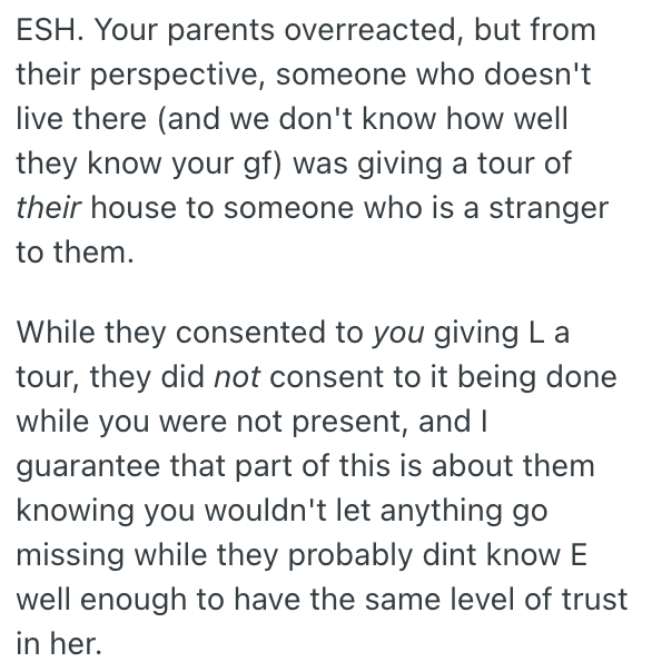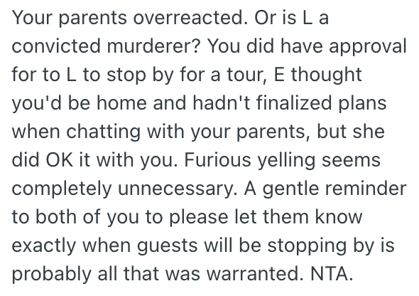 They saw L come in on the Ring doorbell and were furious that E “lied to them” when they asked her what her plans were that day.