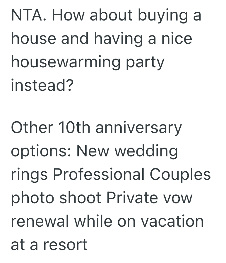 Wife Wants a 10K Wedding Re-Do After 10 Years, But Husband Would Rather Spend The Money On A House Downpayment