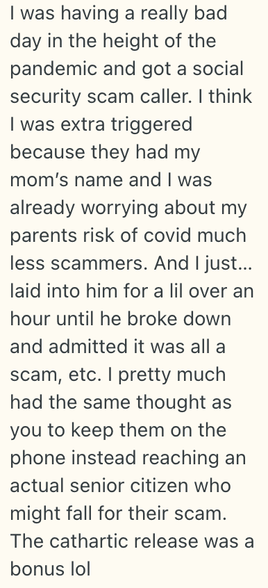 I’ll probably continue to call him and save his number in my phone for when I’m bored and want to make a scammer feel a small part of the way I felt when I got scammed.”
