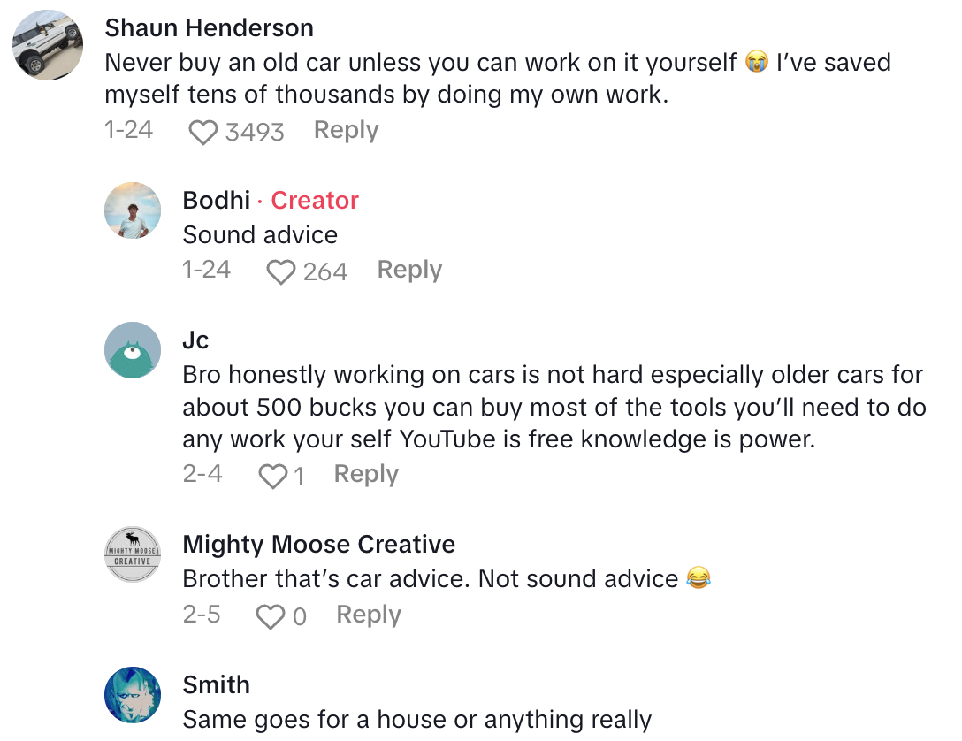 His name is Bodhi and he took to TikTok to tell viewers about the hefty price tag he’s racked up since he recently bought an old car.