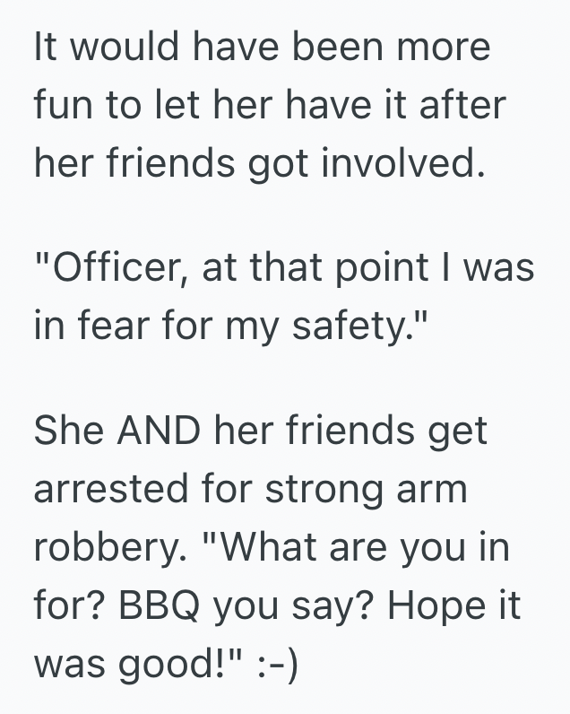 At this point, I just want her to let go of my bag, and a few of her guy friends come over and tell me to stop giving her a hard time and to hand over her food.