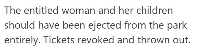 Then everyone in line starts yelling and telling the same story, determined not to let her or her kids on the ride.