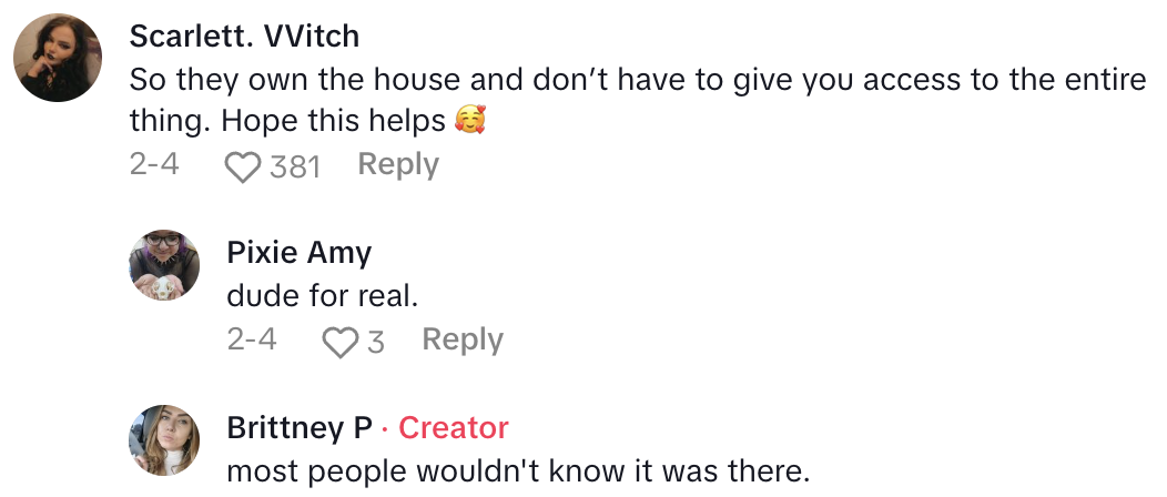 Brittney posted a follow-up video and showed viewers how she found a hidden door in the Airbnb that allows people to access the third bedroom in the house.