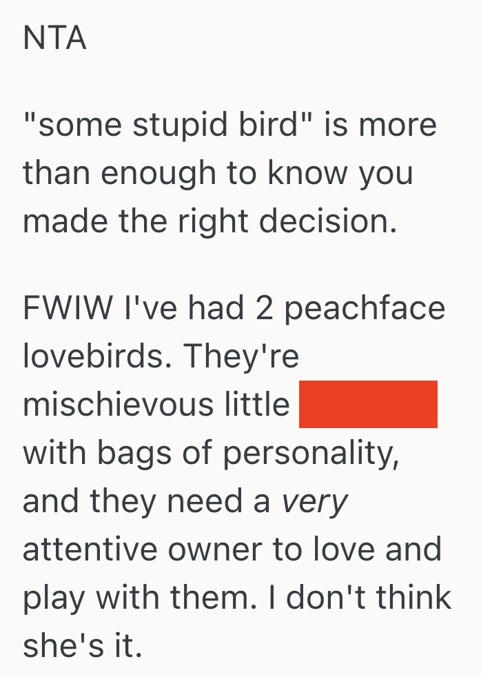 A woman who breeds lovebirds agreed to sell a bird to her friend, but now they aren’t even speaking to each other.