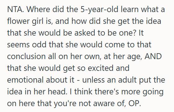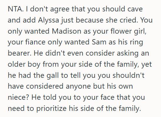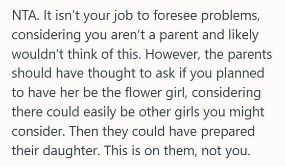 So, what would you do if your fiancé’s niece assumed she’d be your flower girl, but you had already chosen a different family member? Would you change your plans to prevent hurting her feelings? Or would you stick to your original decision?