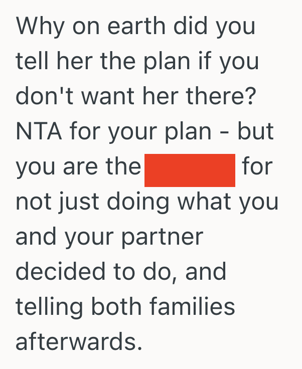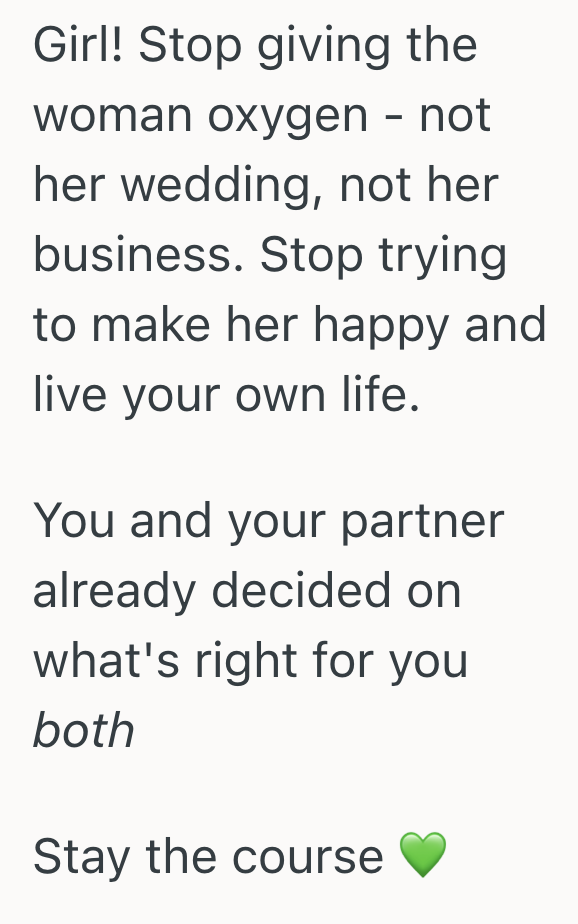 She then went on to say that it’s her right as my mother to be there and it’s unnatural for someone not to want their mother at their wedding, and I clearly don’t really love my partner to rob him of a wedding (which he wants less than me).