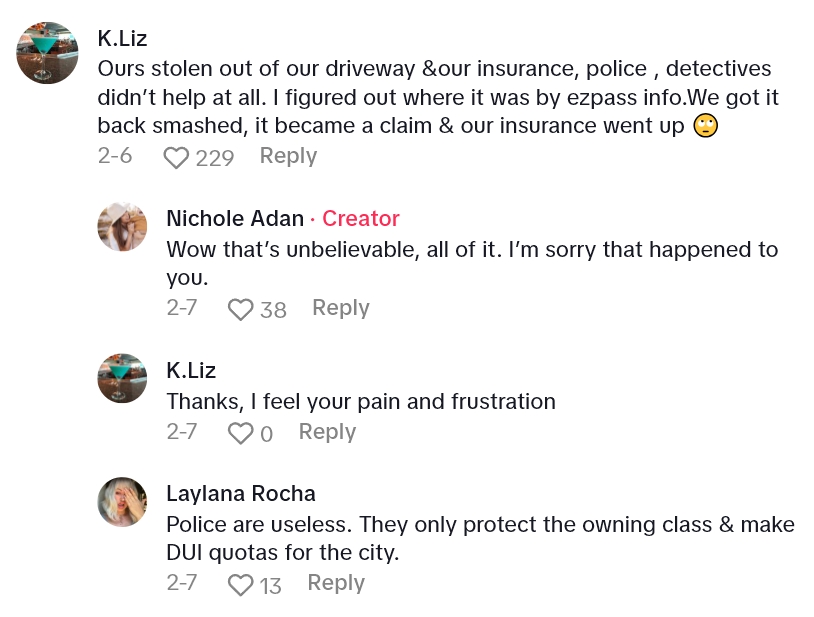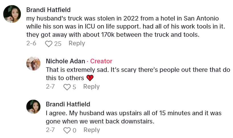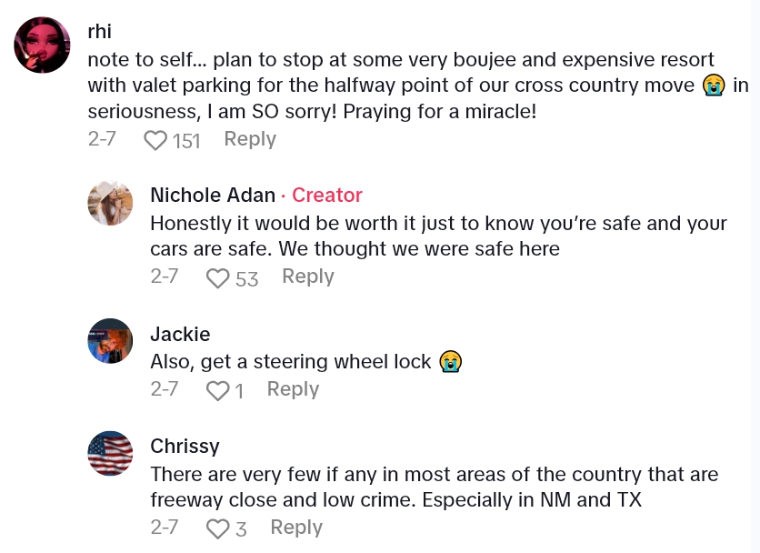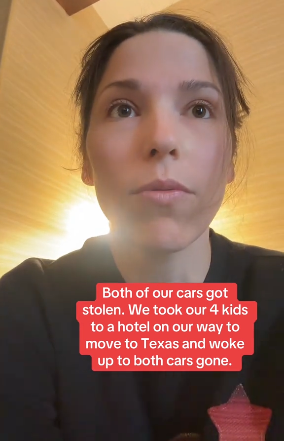 “Both of our cars got stolen. We took our 4 kids to a hotel on our way to move to Texas and woke up to both cars gone.”