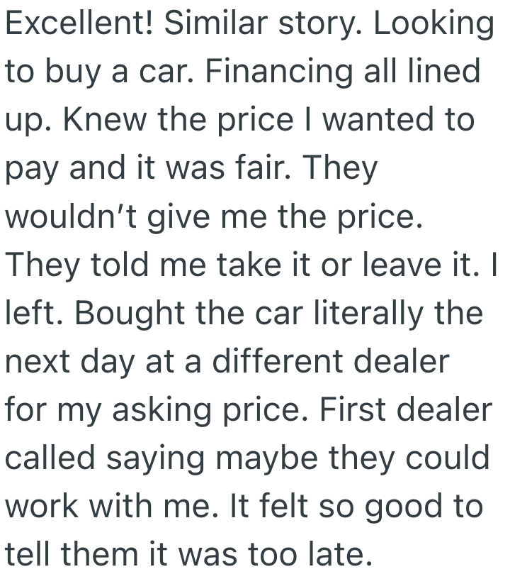 They went to another dealership across town and decided on a completely different make… while they were at that dealership, the salesman from the BMW dealership called them and asked were they now ready to comply in a very arrogant manner…
