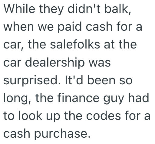After she & my dad test drove a few, they decided on one & advised the salesman that they would be paying with a check from their credit union.