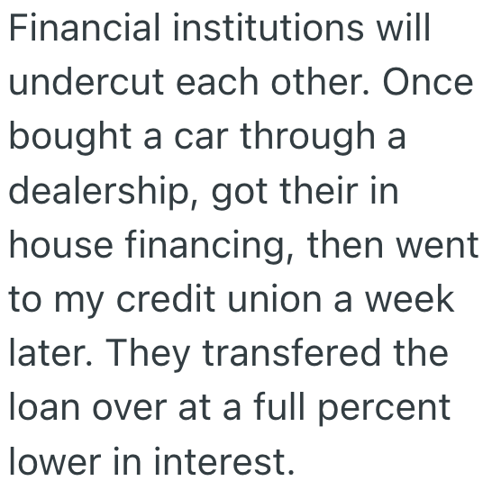Once he heard they were at a different dealership, he tried to tell them that make of cars were terrible and they might be able to work with them on outside financing…