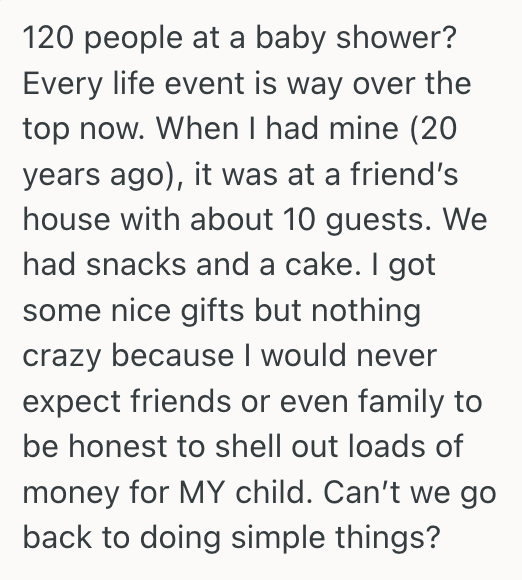 I also pointed out that I had never agreed to pay for a baby shower with 120 guests.