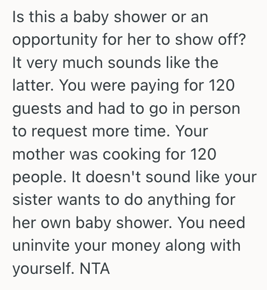 For some reason, she took that as a “my brother said he would pay for the baby shower” and drafted a guest list of 120 people.