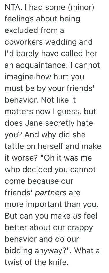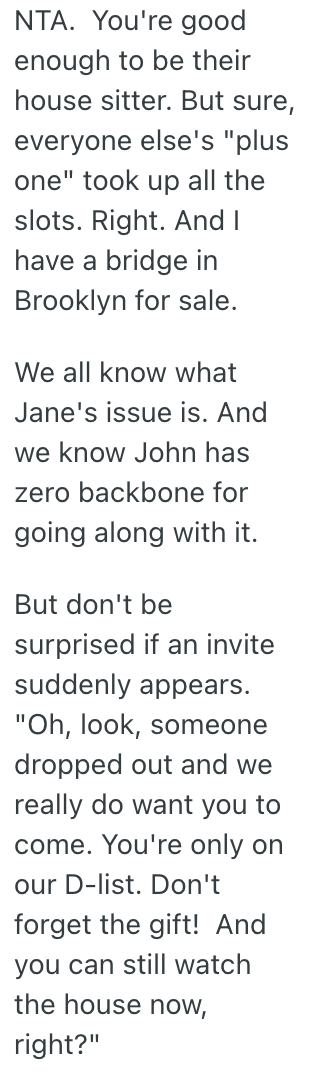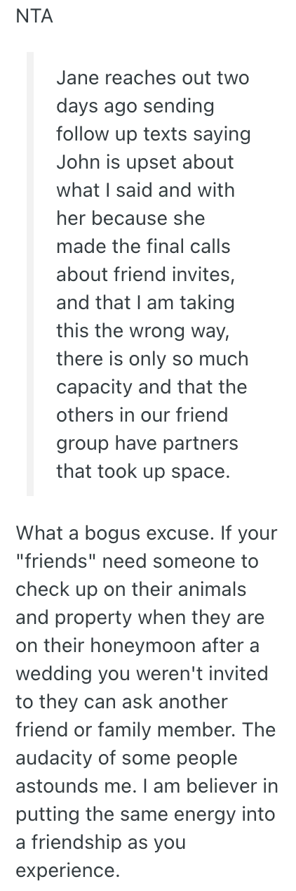 Jane reaches out two days ago sending follow up texts saying John is upset about what I said and with her because she made the final calls about friend invites.