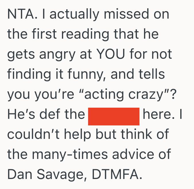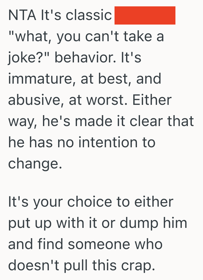 When I get upset and say it’s not funny, he gets angry because I “can’t take a joke” or I’m acting crazy.