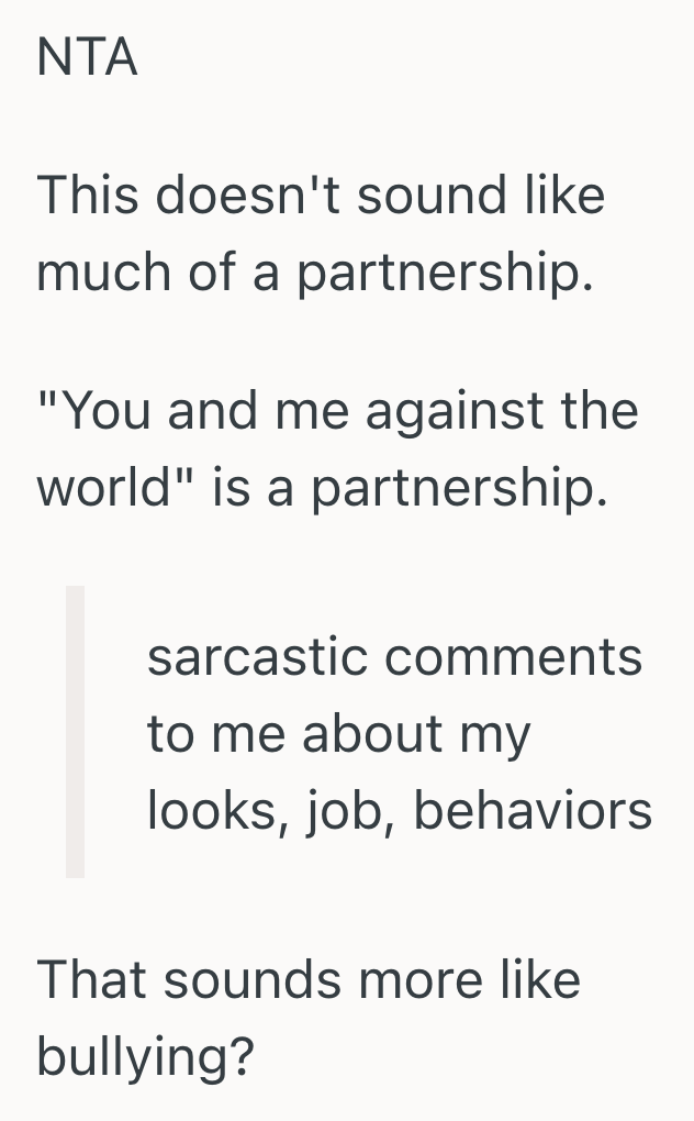 My partner constantly makes sarcastic comments to me about my looks, job, behaviors etc.