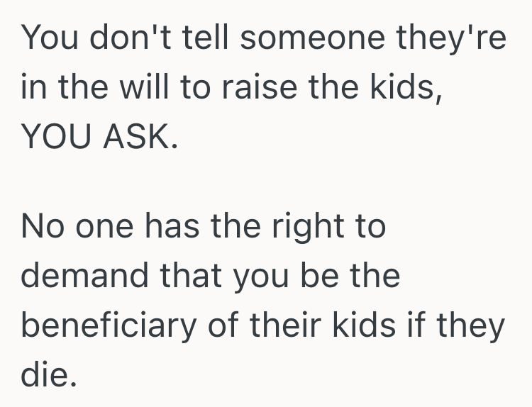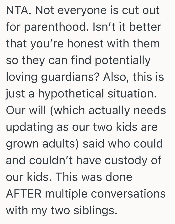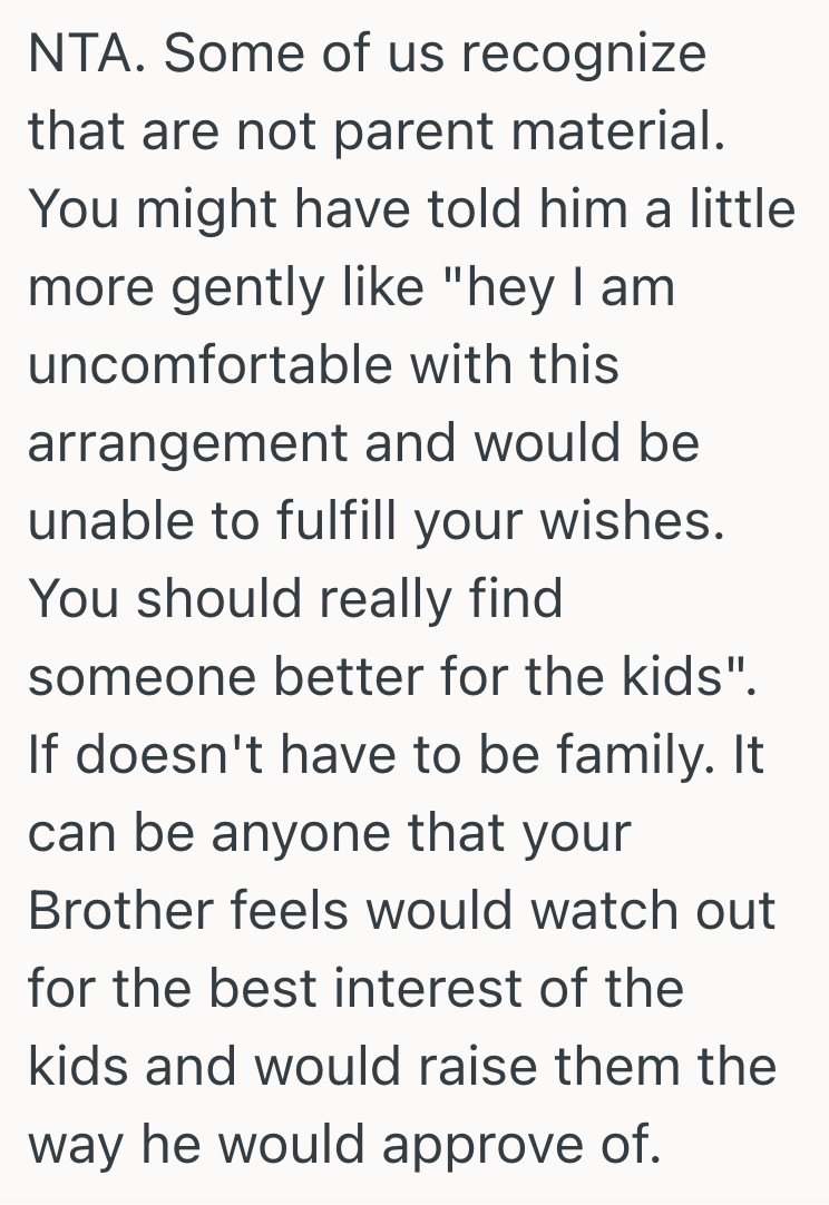 My brother told me he has me down to take care of his kids if him or his wife to ever pass, as he doesn’t and didn’t like how our mother raised us.