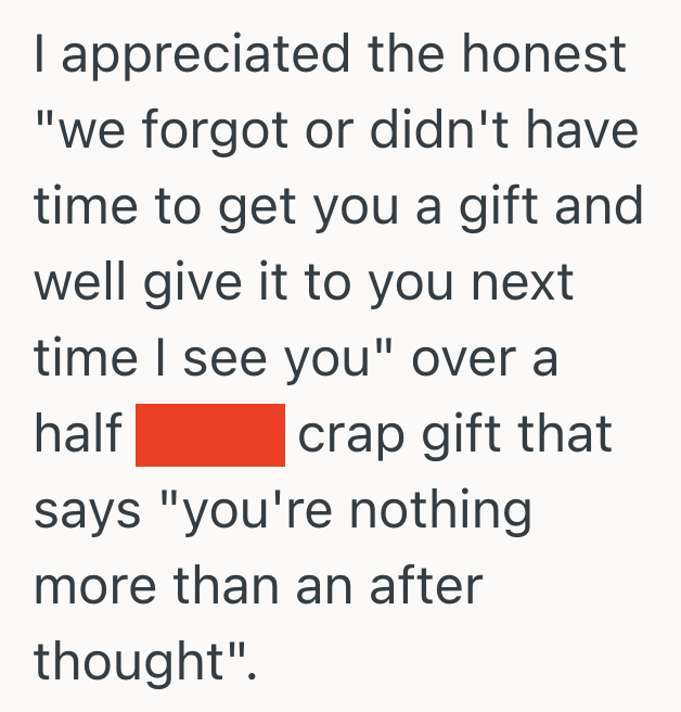 My parents forgot to get him anything, so my dad pulls out the socks from 2 years ago (still unopened and in the original packaging) and says they can just give him this and supplement with some money.