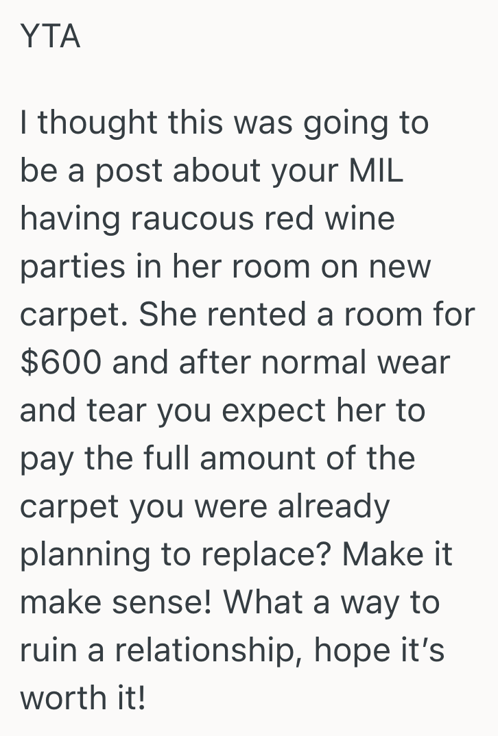 Another person thinks they’ll destroy the relationship with the MIL if they make her pay for the carpet.