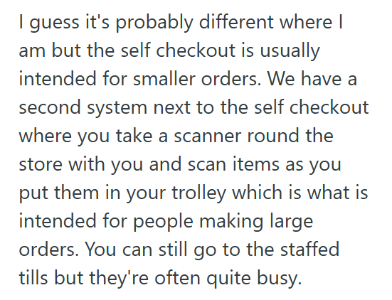 They said that it didn’t matter because there wasn’t enough space in the self-checkout area for a shopping cart (which is wrong.