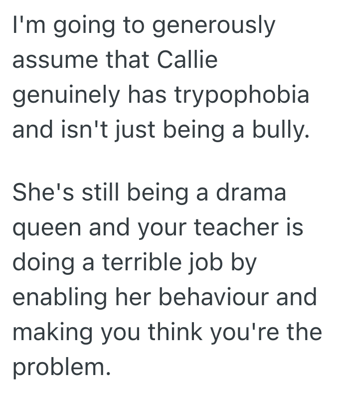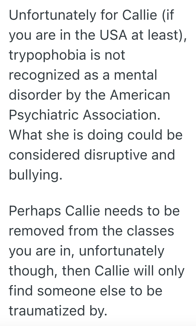 Here’s the problem: There’s a girl in my class, let’s call her Callie (18F), who has trypophobia.