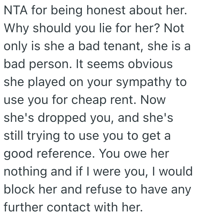 I was also honest in saying she damaged property and failed to keep her bathroom clean or contribute to cleaning communal living areas.