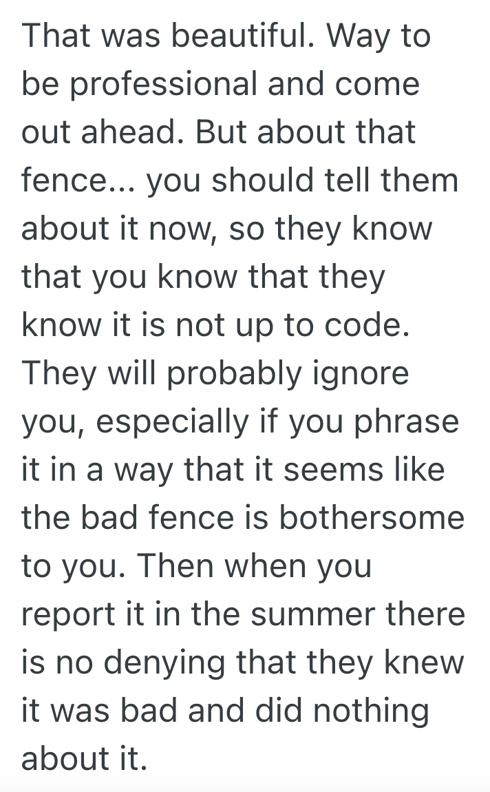 This person has a recommendation about how to handle the fence situation.