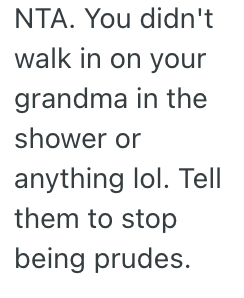 The shower has glass doors, so I could obviously see him, and he could see me, but I didn’t really think that was a problem until I came back out and my grandmother and cousin looked at me.