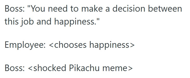 That is what happened to the person in this story, so when his boss said this might not be the line of work for him if he can’t make it work, he called his bluff and quit, putting the boss in a tough spot.