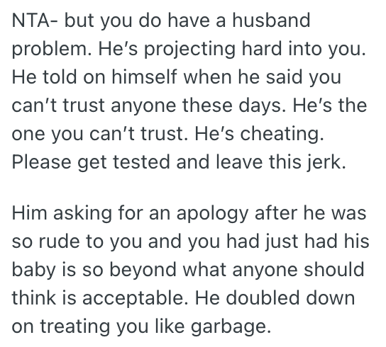 This is an absolutely unacceptable thing to say to a woman who has just given birth to your child.