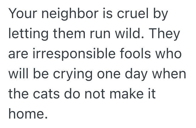 I spoke to my neighbor about the issue, but she dismissed my concerns saying, “Cats will be cats.”