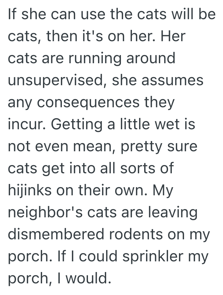 The next day, my neighbor confronted me, upset that her cats came home soaked.