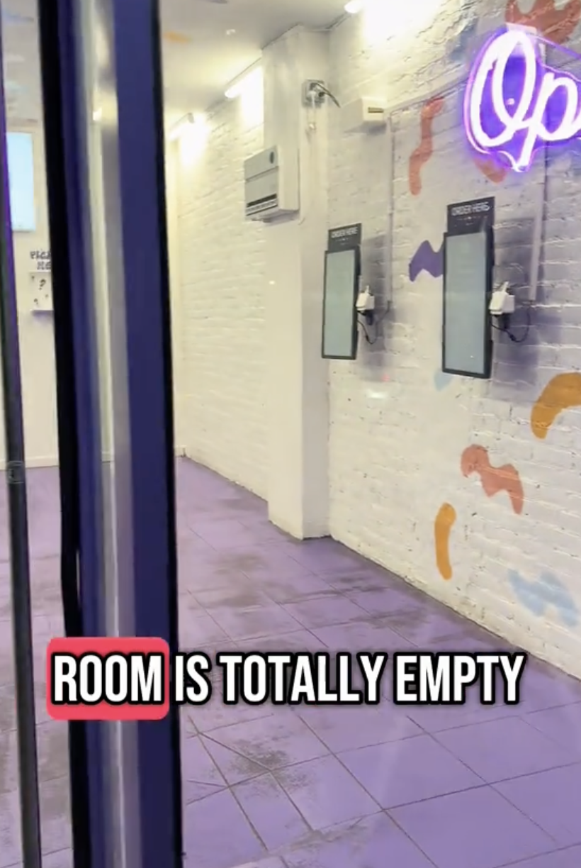 The view of the ice cream shop showed that it was empty inside except for a lot of colors splashed on the floor and the walls. There were touchscreens on the wall where customers could order, but no employees in sight.